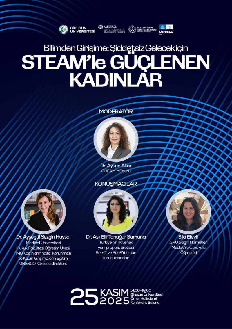 Giresun Üniversitesi UNESCO Kürsüsü ve GÜKAM tarafından düzenlenen Kadına Yönelik Şiddete Karşı Uluslararası Mücadele Günü kapsamında; 25 Kasım 2025 Salı günü 14.00-17.00 saatleri arasında Şehit Ömer Halisdemir Konferans Salonu'nda Medipol Üniversitesi Hukuk Fakültesi Dr. Öğr. Üyesi Ayşegül SEZGİN HUYSAL, BEO Şirketi Kurucusu Dr. Aslı Elif TANUĞUR SAMANCI, Üniversitemiz Sağlık Hizmetleri MYO Paramedik Bölümü Öğrencisi Sıla ELEVLİ'nin konuşmacı olarak katılacakları "Bilimden Girişime: Şiddetsiz Bir Gelecek İçin STEAM ile Güçlenen Kadınlar" isimli panel düzenlenecektir.