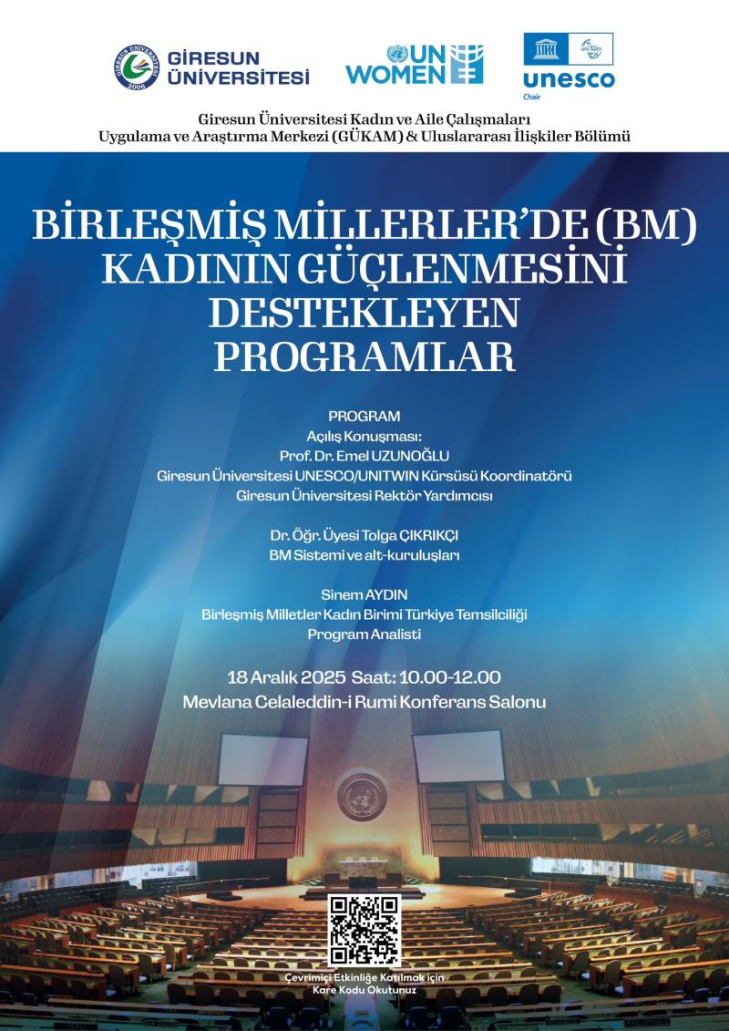 Kadın ve Aile Çalışmaları Uygulama ve Araştırma Merkezi tarafından 18 Aralık 2025 Perşembe günü 10.00-12.00 saatleri arasında Mevlana Celaleddin Rumi Konferans Salonu'nda "BM'de Kadının Güçlenmesini Destekleyen Programlar" başlıklı etkinlik düzenlenecektir.